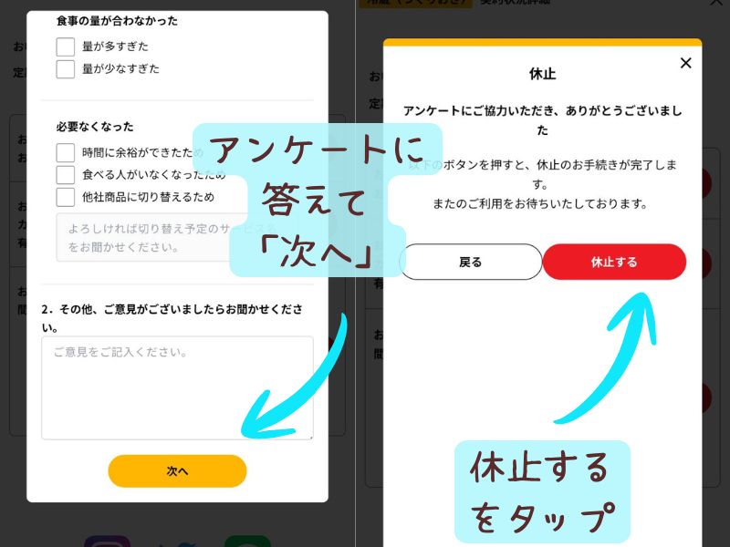 休止する理由などのアンケートが出てくるので、チェックを入れて回答し、「次へ」のボタン。