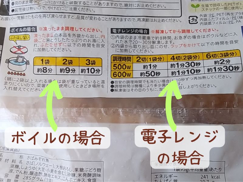 商品の裏面に分かりやすく書いてありますが、ボイルのほか、電子レンジでも温められます。