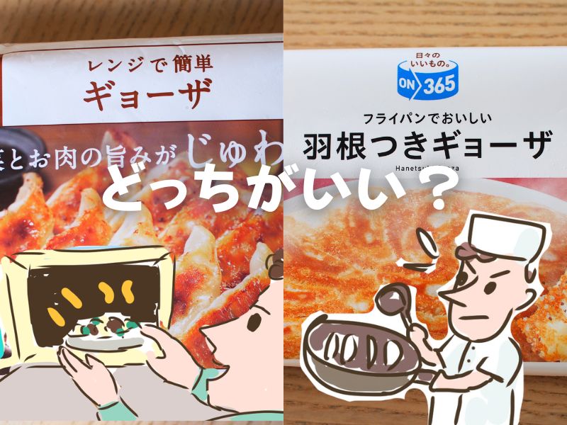 コスモスのPBブランドの冷凍餃子はフライパンで作る羽根つきと、レンチンするだけの簡単餃子がありますが、どっちがいいのだろう?とちょっと迷いますよね。