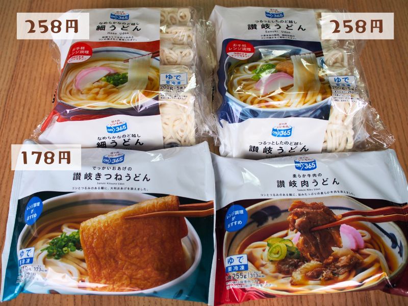 そこで今回は、コスモスで売っていた冷凍うどんを全部購入し、その中にあるコスモスのPB商品【ON365】の冷凍うどんについて、一つずつレビューしていきたいと思います。