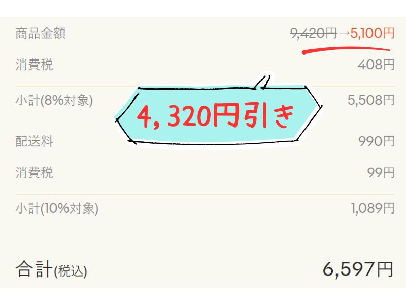 初回キャンペーンサイトから購入すると10食セットになるのですが、この場合は9,420円の商品が5,100円に割引され、4,320円引きになります。