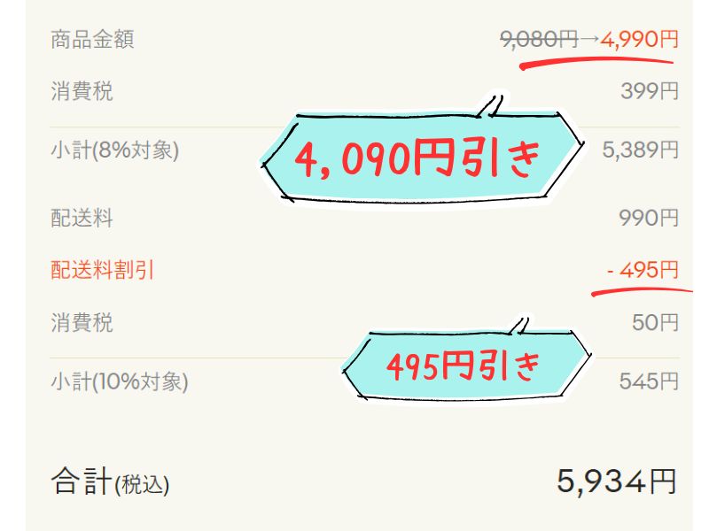 また、こちらの場合は送料半額になるので、送料が545円だけ足されて最終金額は5,934円となります。