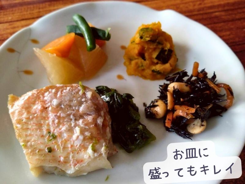 まず赤魚のサイズが大きいのが目を引きます。減塩の冷凍弁当でこれだけ大きいのは珍しいですが、骨もなくて食べやすかったです。