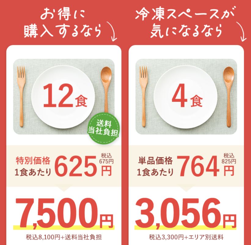 こちらの特別割引のサイトからだと2つのセットから選べますが、なかでも12食セットは1食675円とかなりお得。