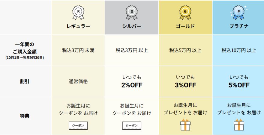 1年間の合計購入金額により、毎回の購入品が割引額で安くなり、誕生日月にはクーポンやプレゼントがもらえます。