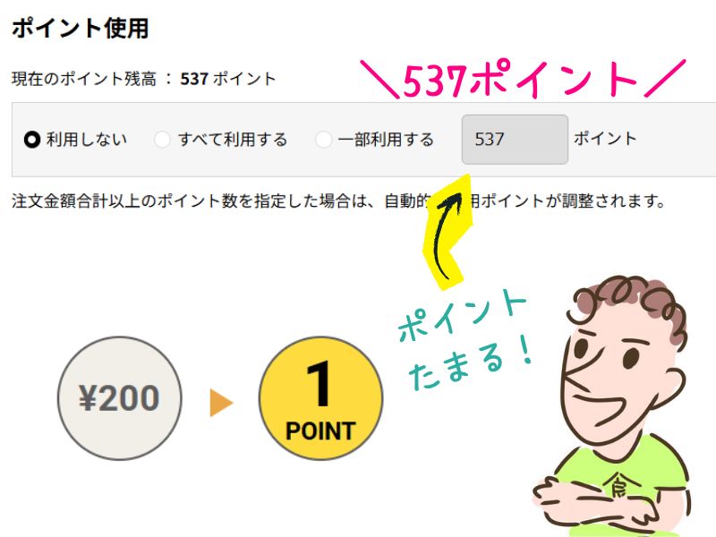 あれ?500ポイントじゃないの?と思って確認すると、200円で1ポイント付くそうです。