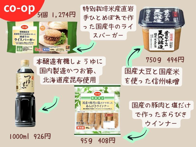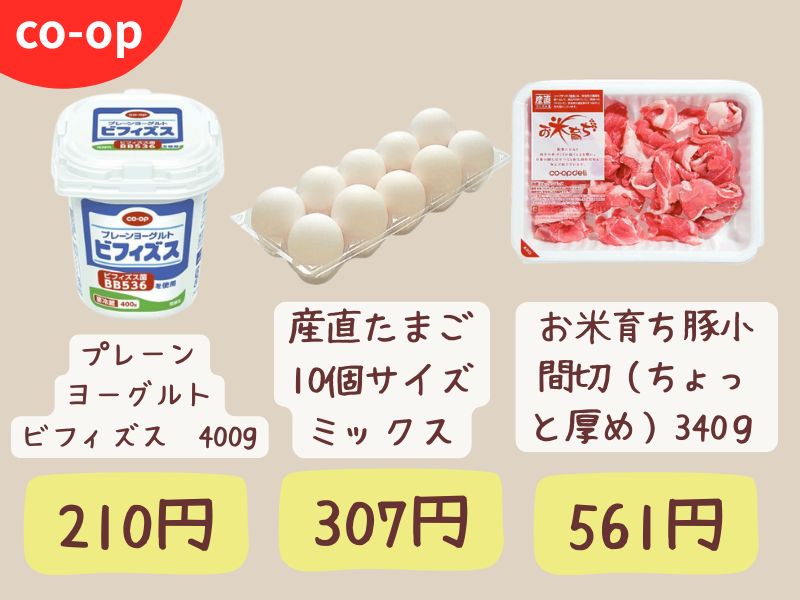 | オリジナル商品をはじめ、品質にこだわった食材、産直食材が多い その分少し値段が高い | スーパー並みの品揃えで価格重視 co-op商品・離乳食が充実 |