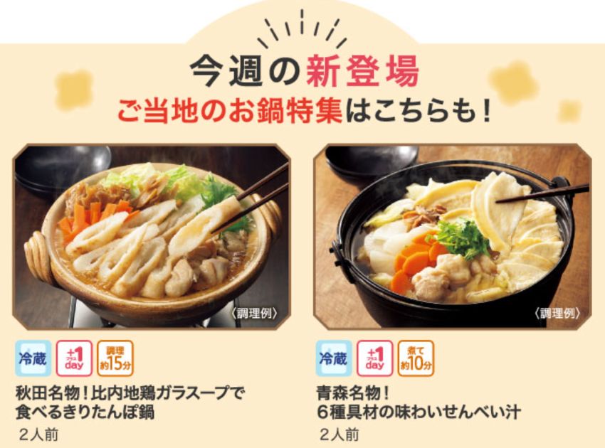 3日分のお料理セット![]() (副菜付きx3食分) 週替わりで 1種類 2人分で約4,800円 3人分で約5,300円 | 副菜付きミールキット![]() 10品 (副菜1品と副菜2品で5種類ずつ) 2品2人前1,077円 2品3人前1,458円 3品2人前1,317円 3品3人前1,641円 |