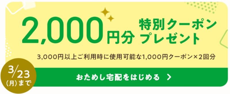 すでに通常の「お試しセット」を購入してしまった人は使えませんが、購入前から「宅配も利用してみたい」と考えてる方は、最大で合計5,000円分のクーポンがもらえる「おためし宅配」から申し込むのがお得な入会方法です。