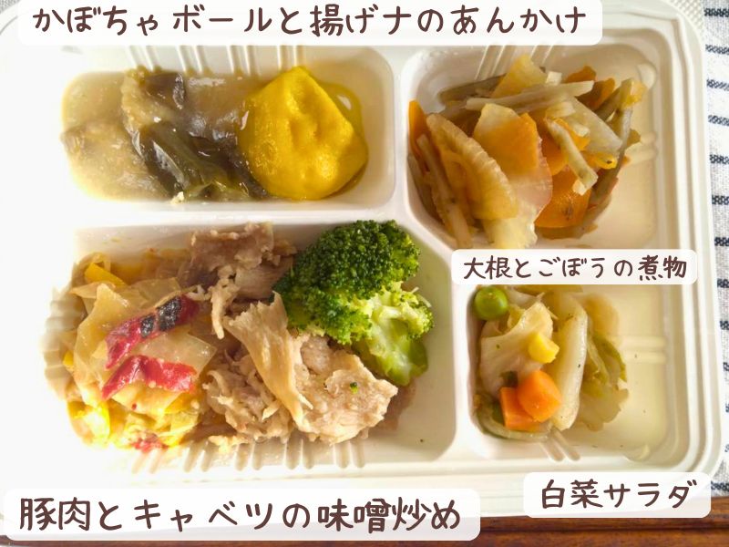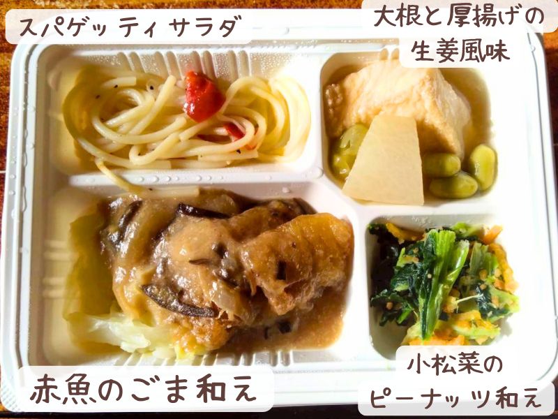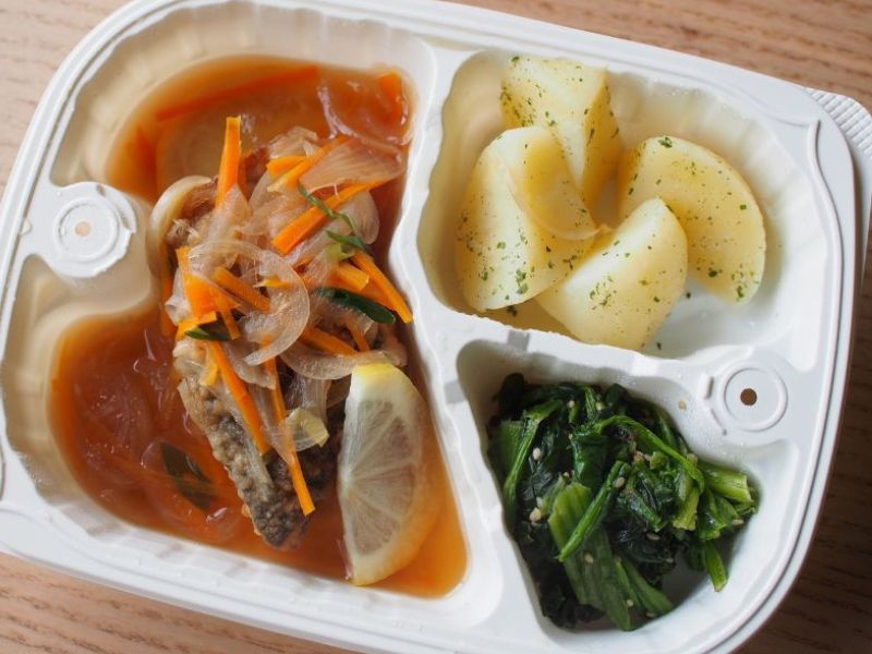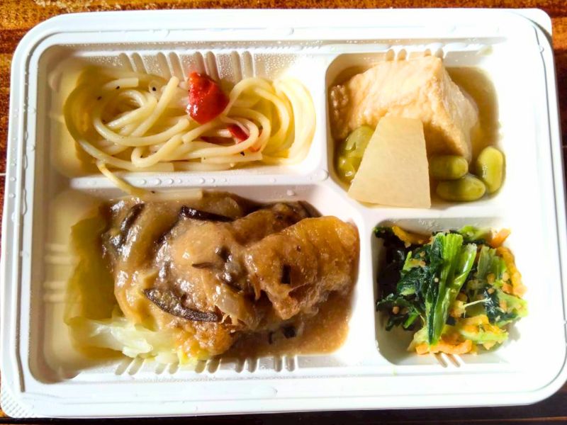 量が少ないのと、献立が特に中高年を対象にしたものではない(甘め)のが気にならなければコスト面では利用しやすいお弁当です。
