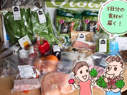 - 新鮮食材(冷凍食品を含む)が2人分x5日分届く!