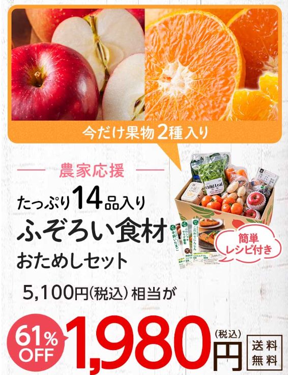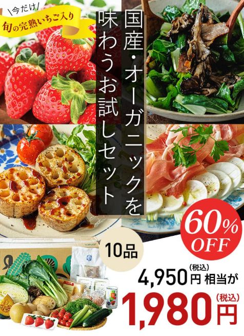 9位らでぃっしゅぼーや![]() ポイント解説へ | お試しセット 1,980円! (通常5,800円) 【野菜+フルーツメイン】 お試しセットへ▶︎ |