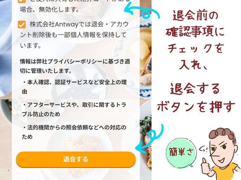 確認事項にチェックを入れ、退会するボタンを押す