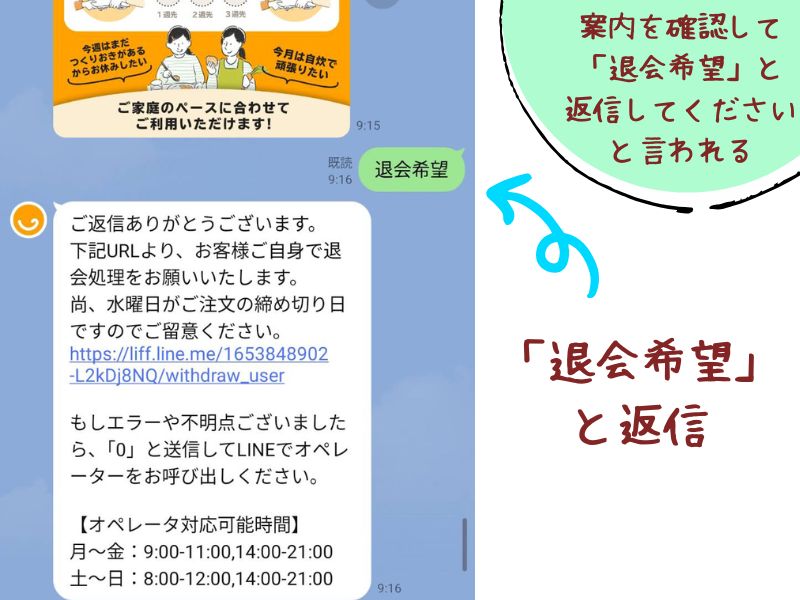 自動メッセージが流れた後で「退会希望」とメッセージを送信