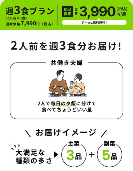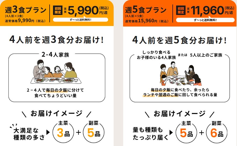 2人家族用(2人前x3食分)が新しく登場しましたが、基本的には4人分の3食か5食のプランから選べます。