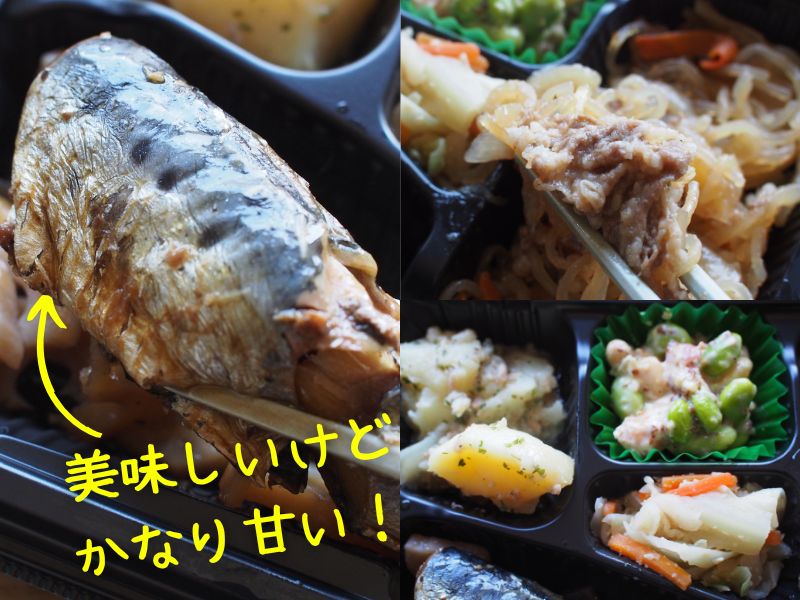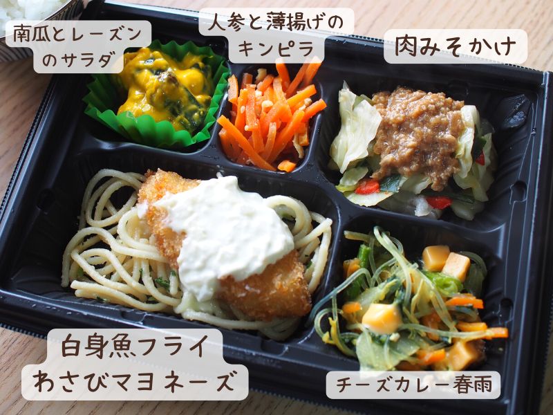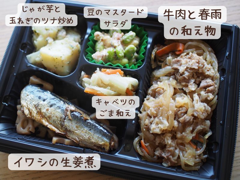 すき焼き風に見えた牛肉と春雨の和え物は甘くなかったのですが、いわしとその周りのレンコンの煮物がかなり甘かったです。たまにならいいのですが、ご年配で糖質が気になる方にはあまり向かないかな・・と思いました。