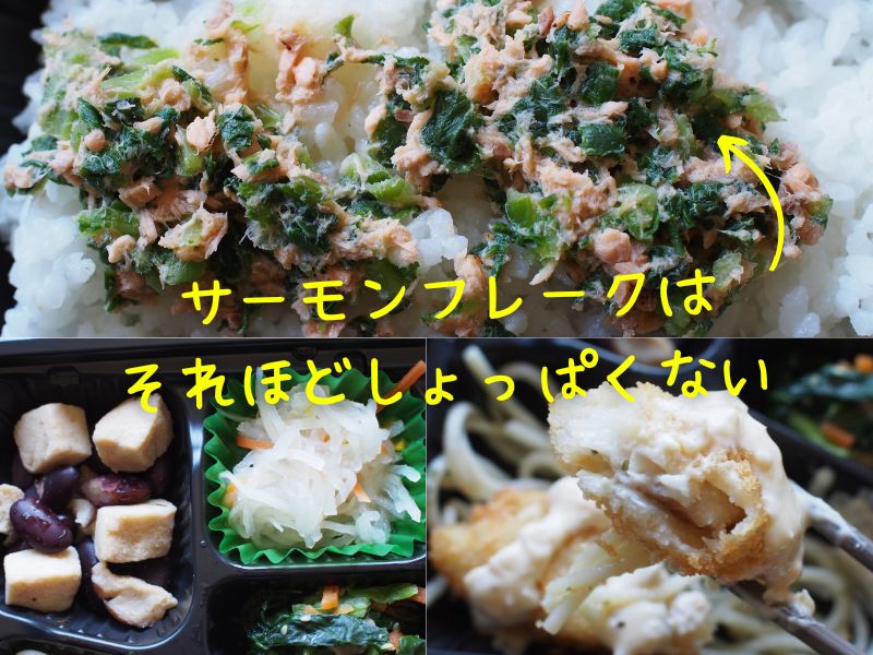 サーモンフレークはこんもりかけてあるので、一瞬多いのでは?と思ったのですが、塩気はかなり抑えられているので安心して食べられそうです。
