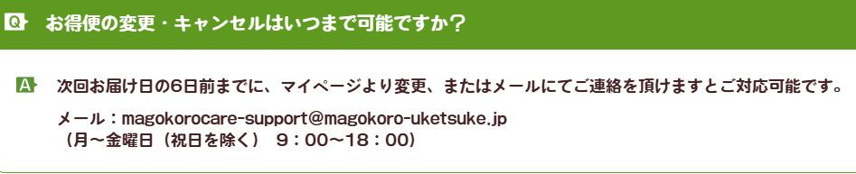 次回お届け日の6日前までに、マイページの解約ページで手続きし、表示された電話番号にかけてプッシュフォンで解約を完了させます。