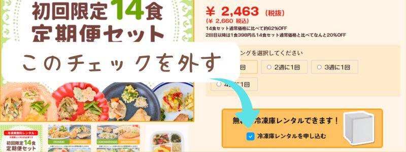 冷凍庫のレンタルは要らないかな…という人はこの「冷凍庫レンタルを申し込む」のチェックをはずすと通常の定期価格で購入できます。